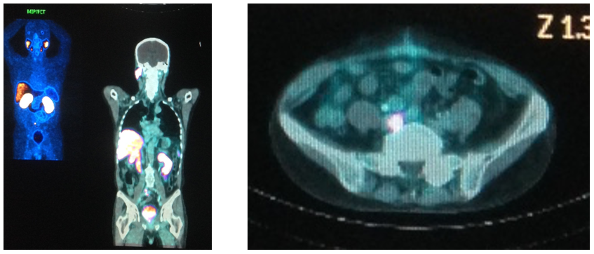 – LN ilíaco comum E 1,4cm (SUV=10,9), ilíaco comum D 1cm (SUV=6,7)