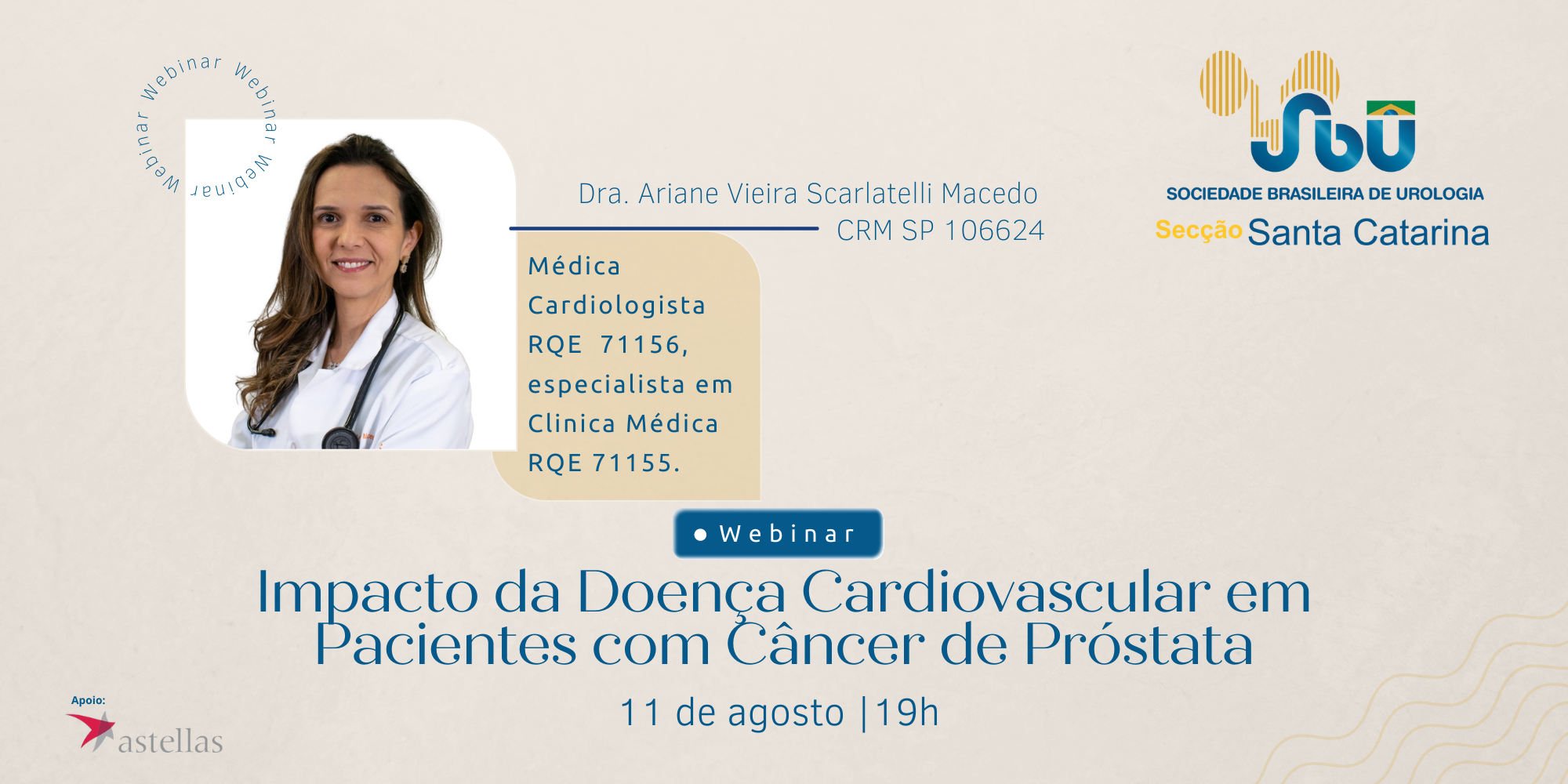 A SBU SC realizou no dia 11 de agosto o Webinar com Tema: Impacto da Doença Cardiovascular em Pacientes com Câncer de Próstata com a Dra. Ariane Vieira Scarlatelli Macedo - CRM SP 106624.